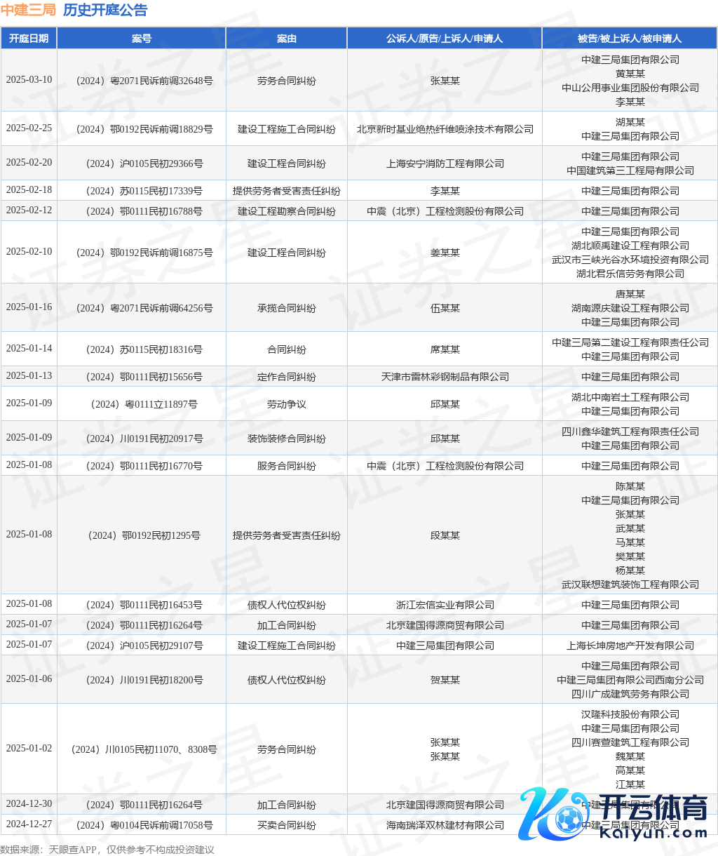 本站音信,左证天眼查APP泄露,近日公布了一则中建三局集团有限公司行动原告/上诉东说念主的开庭公告,刺眼骨子如下: