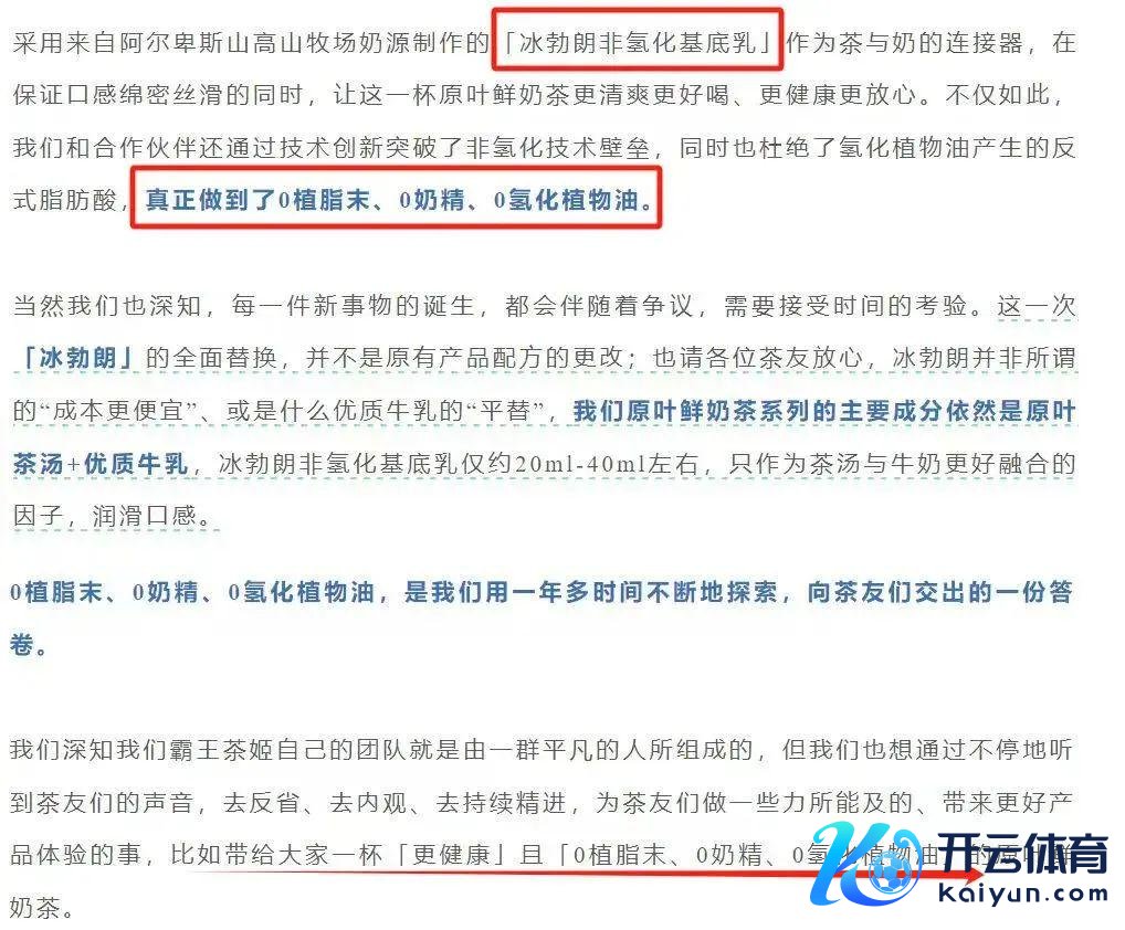 湖南金州讼师事务所讼师邢鑫默示,霸王茶姬使用冰勃朗行动原料,并注视宣传“更健康”且“0植脂末、0奶精、0氢化植物油”。