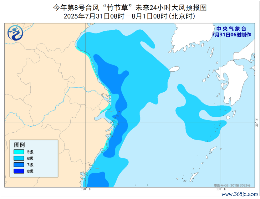 大风预告:7月31日08时至8月1日08时,黄海中南部、东海西部、江苏沿海、上海沿海、长江口区、杭州湾、浙江沿海、福建北部沿海将有6-8级、阵风9-10级风。另外,江苏东部、浙江东北部、上海等地部分地区将有5-6级、阵风7-8级风。降水预告:7月31日08时至8月1日08时,安徽中南部、江苏中部、浙江西部、山东半岛南部等地部分地区有大到暴雨,其中,安徽中南部部分地区有大暴雨(100-200毫米)。