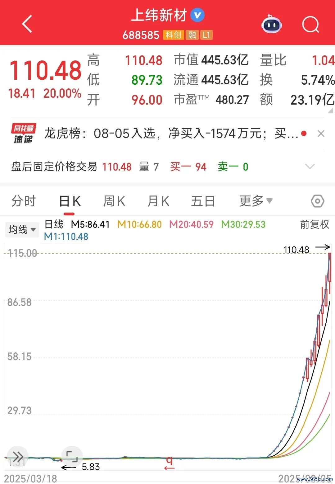 逼迫8月5日收盘,上纬新材报110.48元/股,总市值攀升至445.6亿元,年内涨幅达到1566%。
