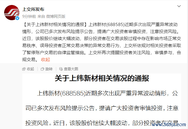 另外,8月5日晚间,上交所发布对于上纬新材相干情况的通报称,上纬新材近期屡次出现严重杰出波动情形,公司已屡次发布风险指示公告,提请繁多投资者审慎投资,防备投资风险。近日,该股股价链接大幅波动,部分投资者在走动该股历程中存在影响阛阓平淡走动规律、误导投资者平淡走动有联想的杰出走动活动,上交所依规对相干投资者采选了暂停账户走动的自律监管次第。上交所再次提醒投资者热心风险,审慎参与,合规走动。